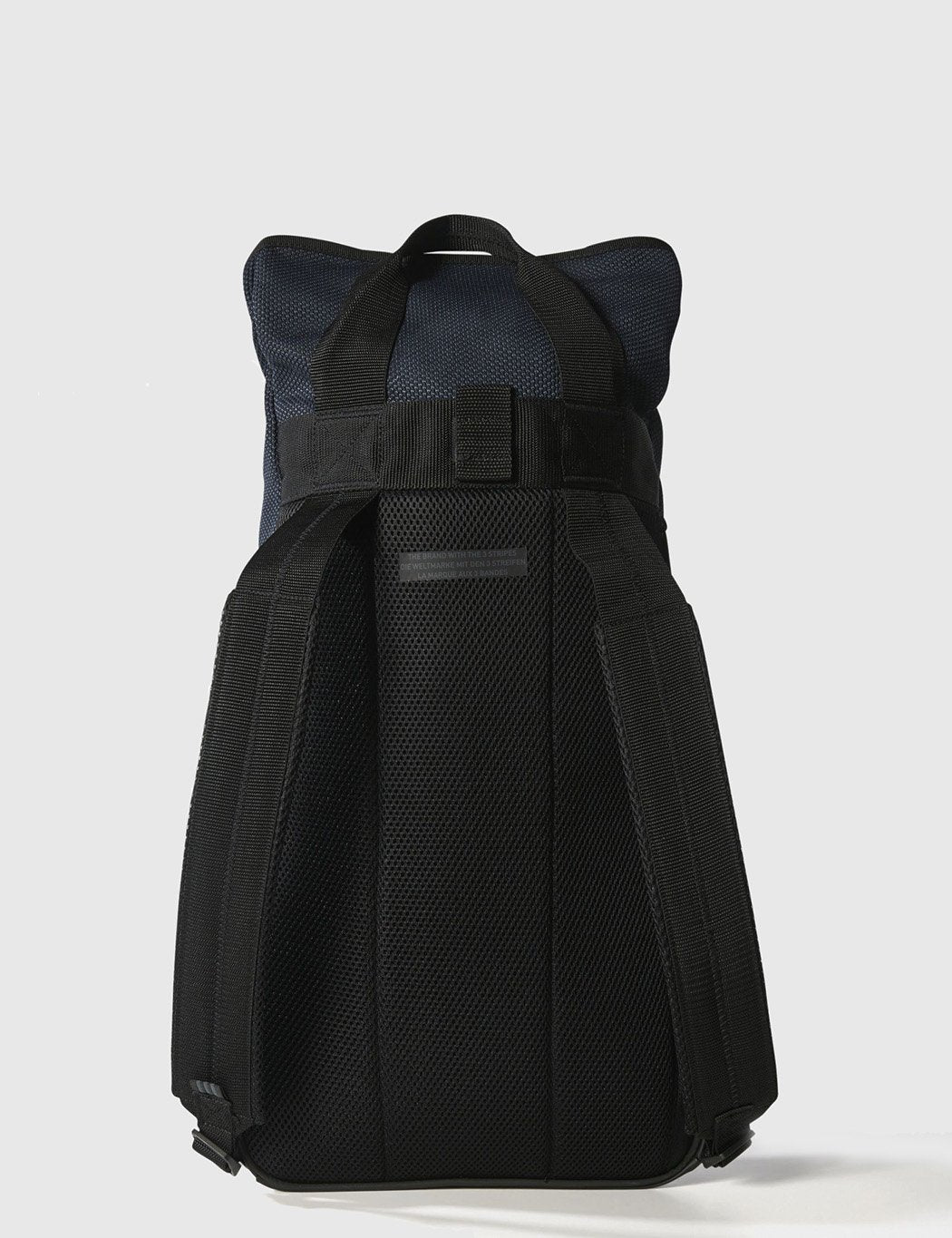 The Top Knit backpack is a tech-inspired bag and made with Primeknit. It features one large compartment, roll-top closure, separate laptop compartment in back, padded adjustable shoulder straps, carry handles, front panel with hook and loop straps and screenprinted Trefoil logo.