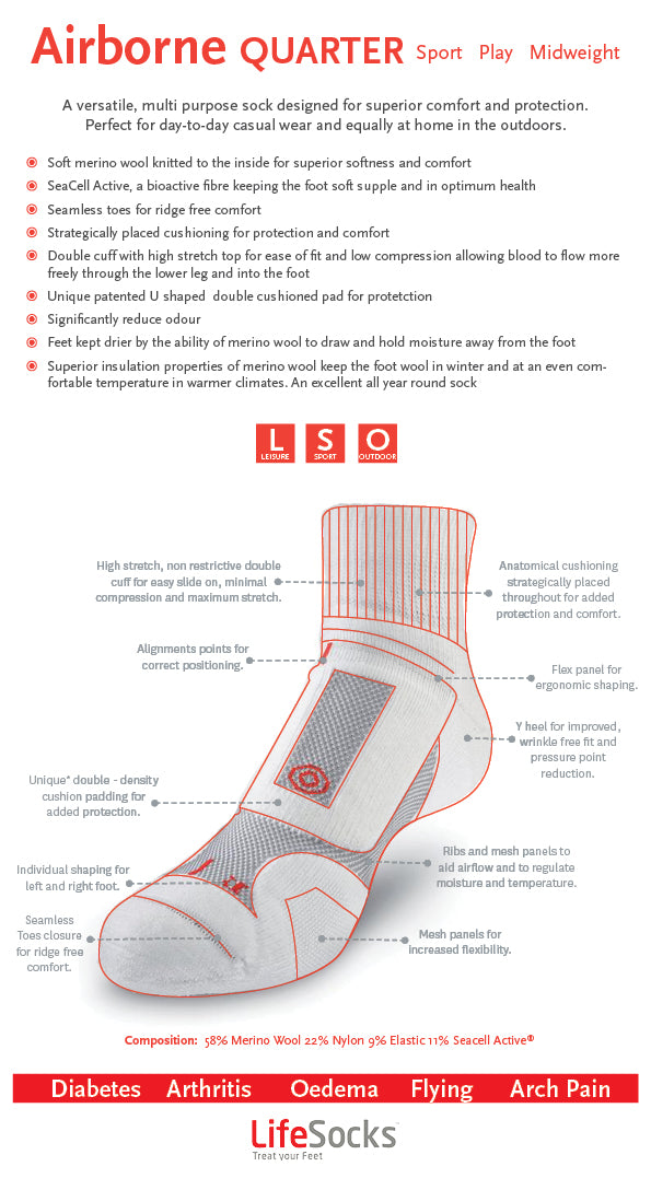 LifeSocks™ use a natural blend of merino and SeaCell® Active. This carefully manufactured combination provides the following unique benefits