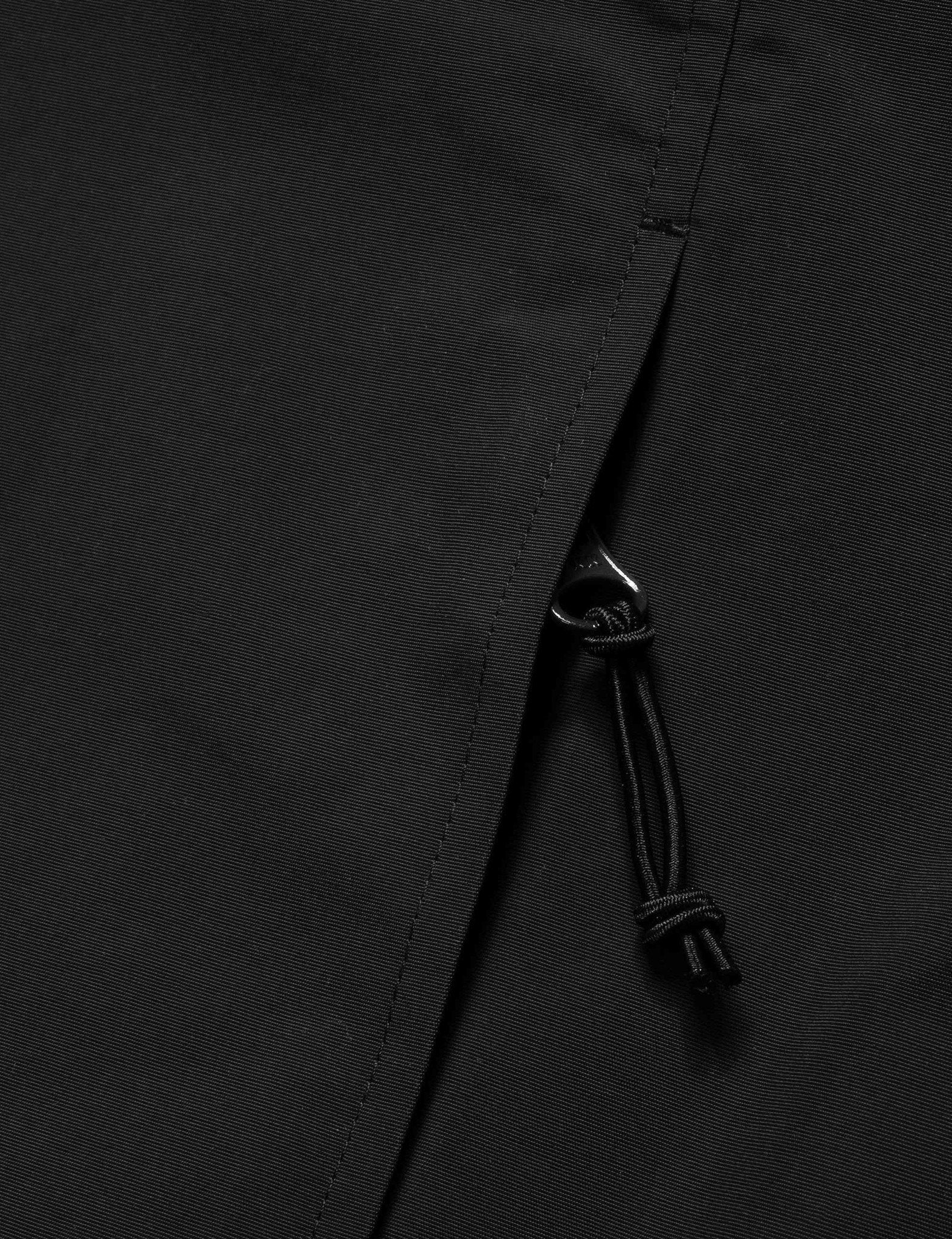The Nimbus Pullover is in a water repellent teflon and milky coated fabric. It features adjustable hood and bottom band, pocket with hidden zip, side opening with zip and square label.