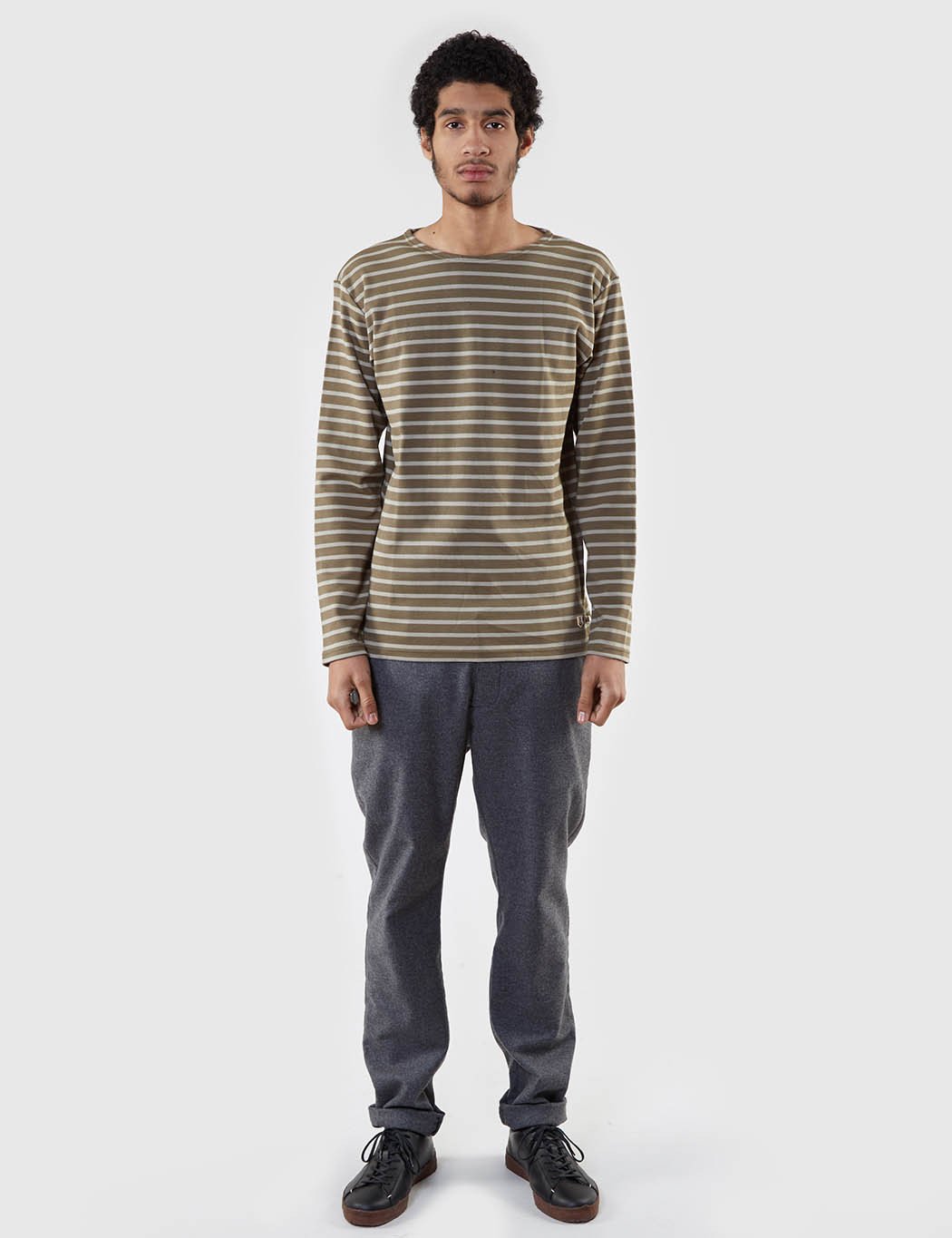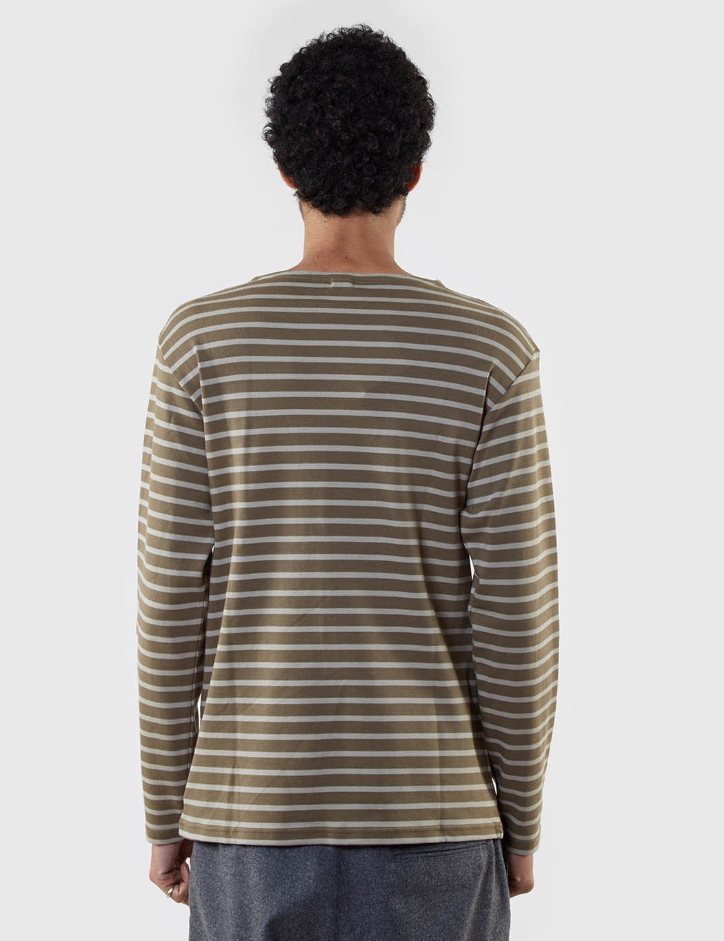 The Armor Lux Heritage long-sleeve "Breton" tshirt in Olive/Khaki green from the Armor Lux Fall/Winter 2016 collection. It features a loose crewneck and a small label by left hem.