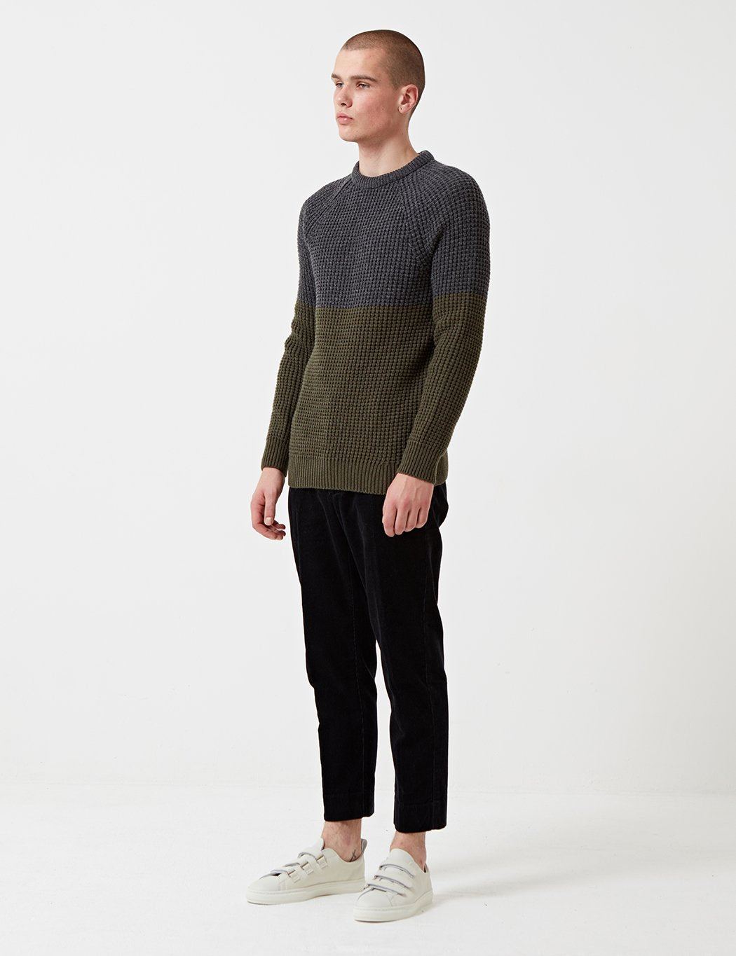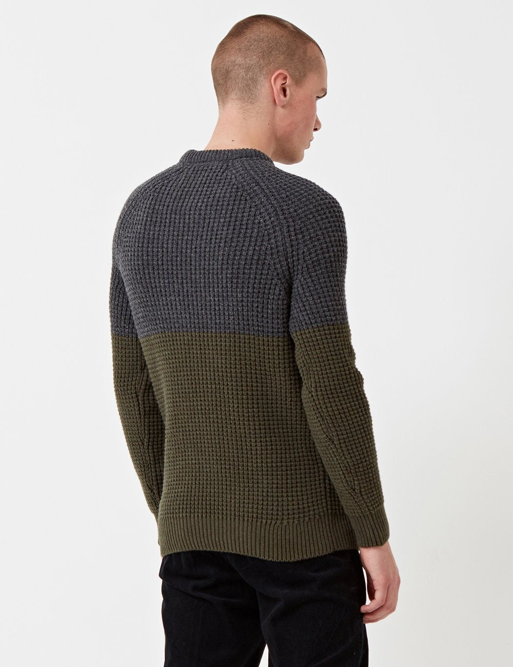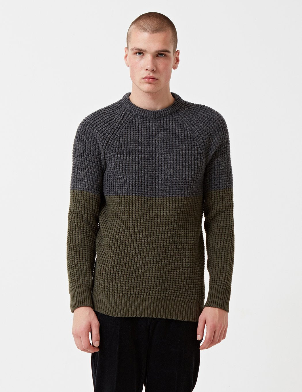 The Barns Ness is a knitted colourblock crewneck sweatshirt from Wood Wood's 15th anniversary collaboration. It features raglan sleeves and ribbed collar, cuffs and hem.