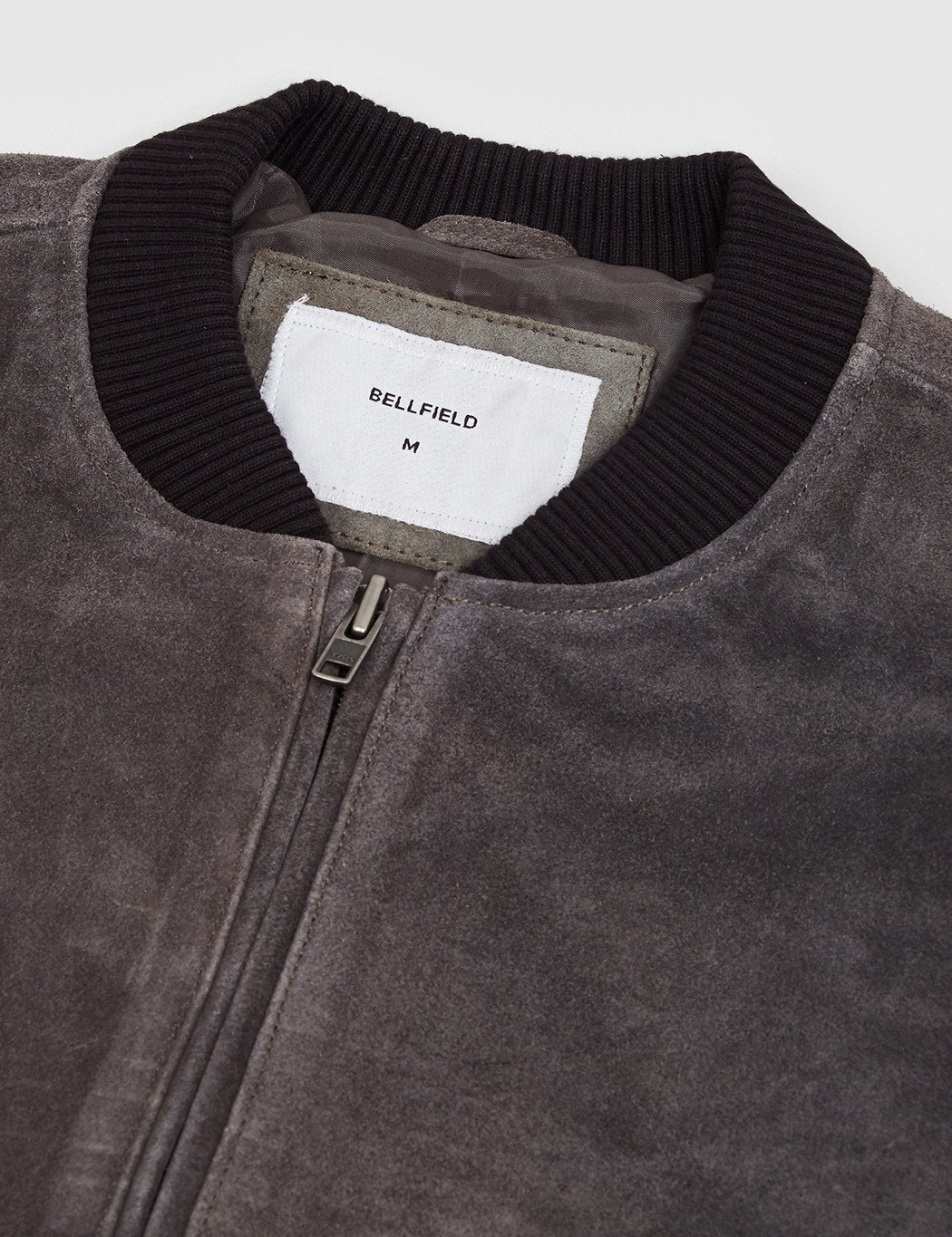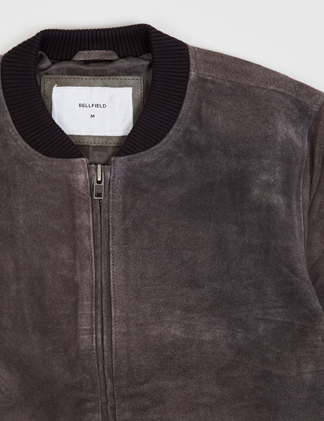 The Bellfield Hadon suede bomber jacket in Charcoal grey from the Bellfield Fall/Winter 2016 collection. It features a full double-zip front, stand-up collar and ribbed hem, collar and cuffs.