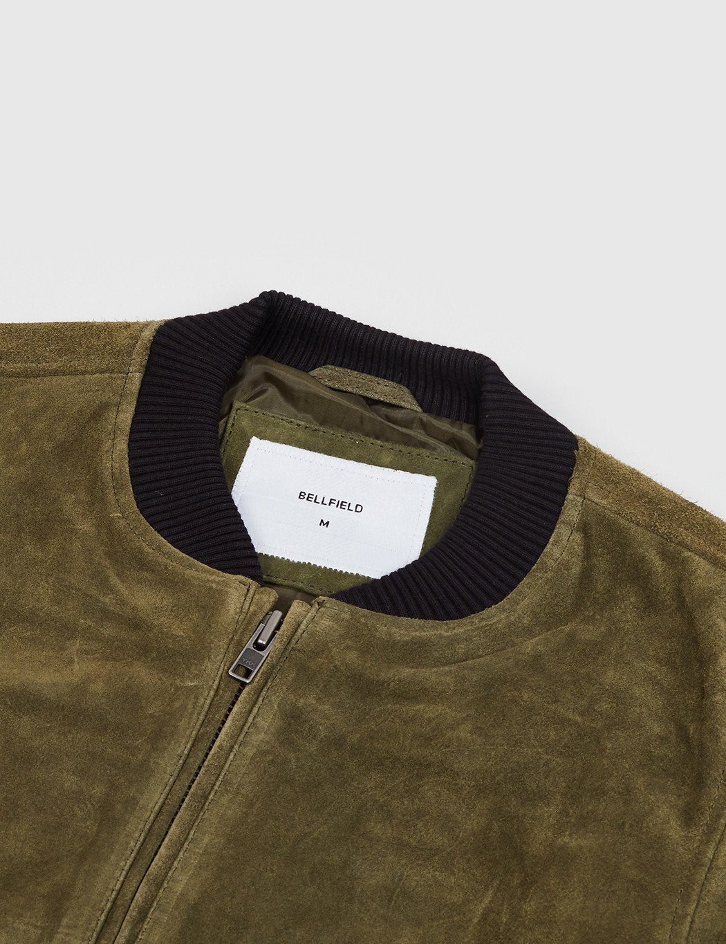 The Bellfield Hadon suede bomber jacket in Dark Olive from the Bellfield Fall/Winter 2016 collection. It features a full double-zip front, stand-up collar and ribbed hem, collar and cuffs.