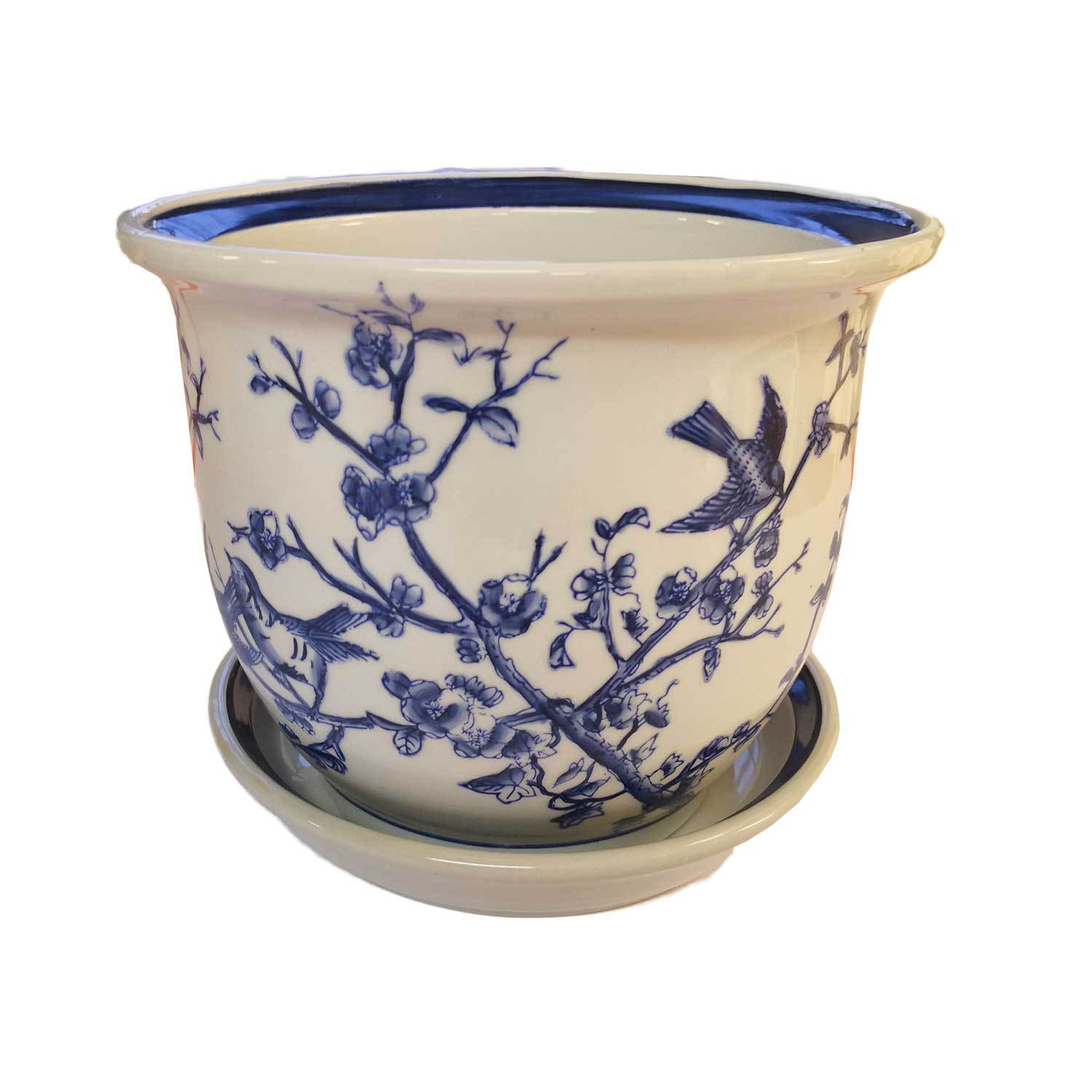 Kruka med fat. Höjd: 18 cm, Bredd: 21 cm.