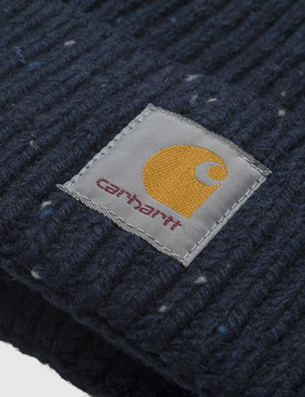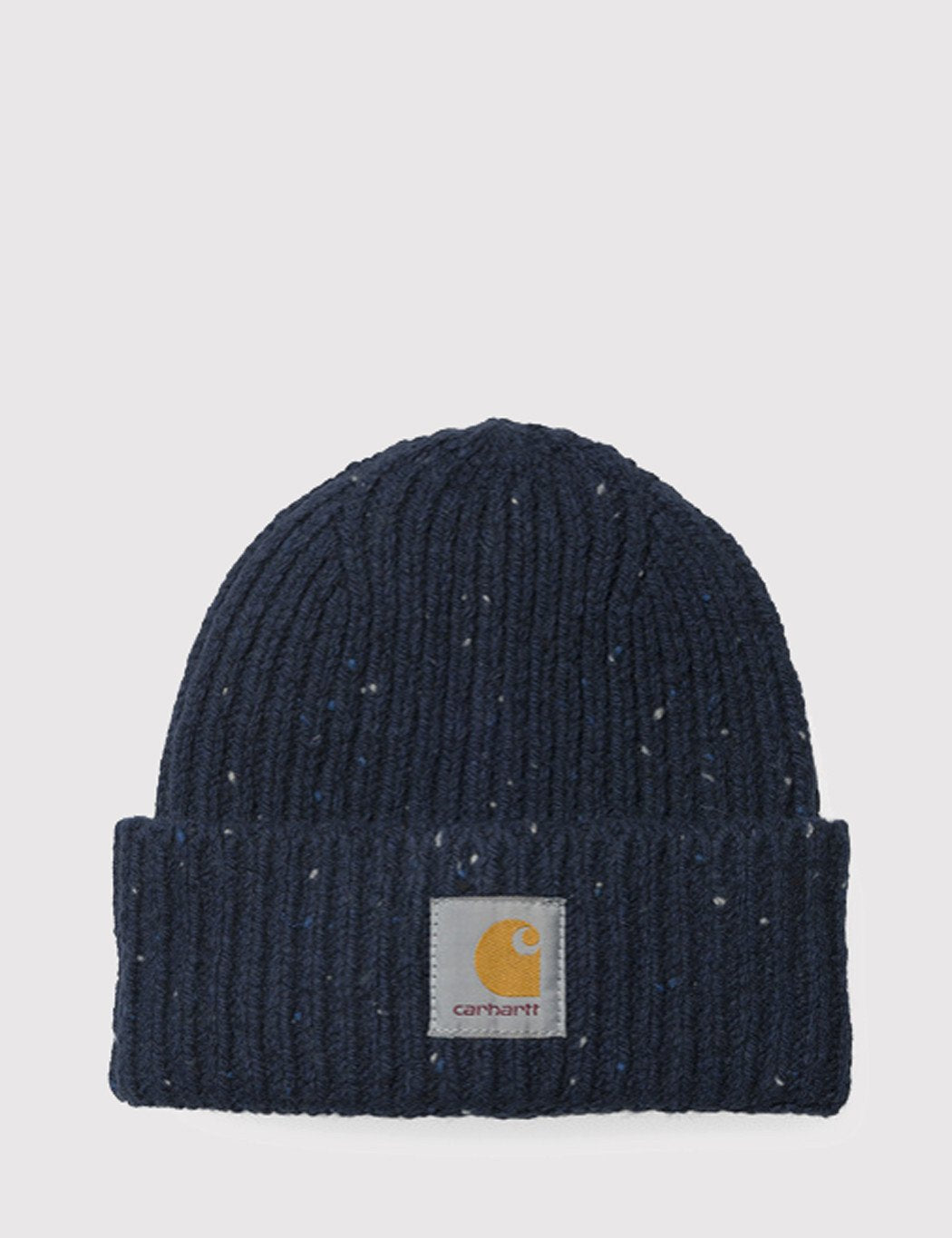 The Carhartt Anglistic beanie hat in Navy Heather from Carhartt Fall/Winter 2016 collection. It features a stretchable rib-knit fabric, cuffs fixed by button at back side and a square label.