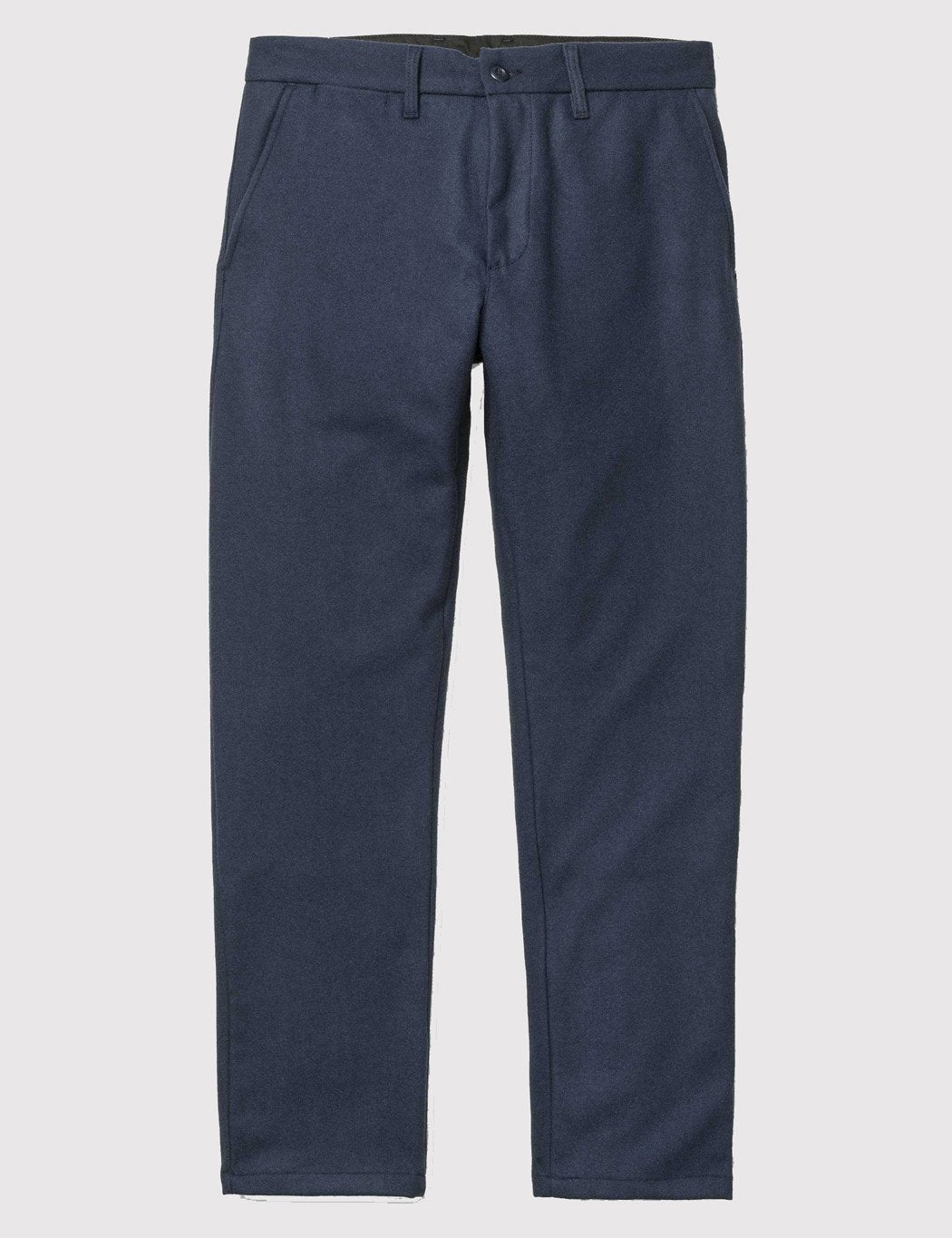 The Carhartt Johnson wool pant in Navy Blue from the Carhartt Fall/Winter 2016 collection. They are lined and feature a low waist, bartack stitching, zip fly and a square label.