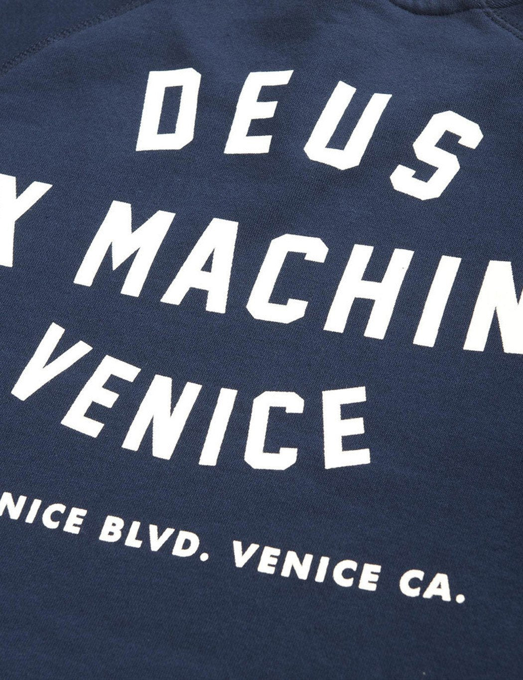 The Deus Ex Machina Address Venice LA sweatshirt in navy blue from the Deus sweatshirts core collection. This Deus sweatshirt is a standard-fit raglan crew with Deus Venice Address print.