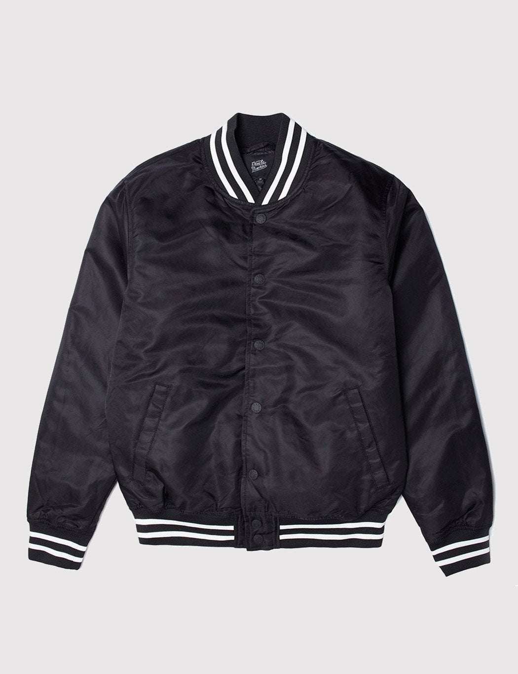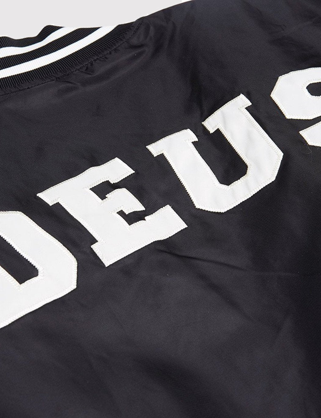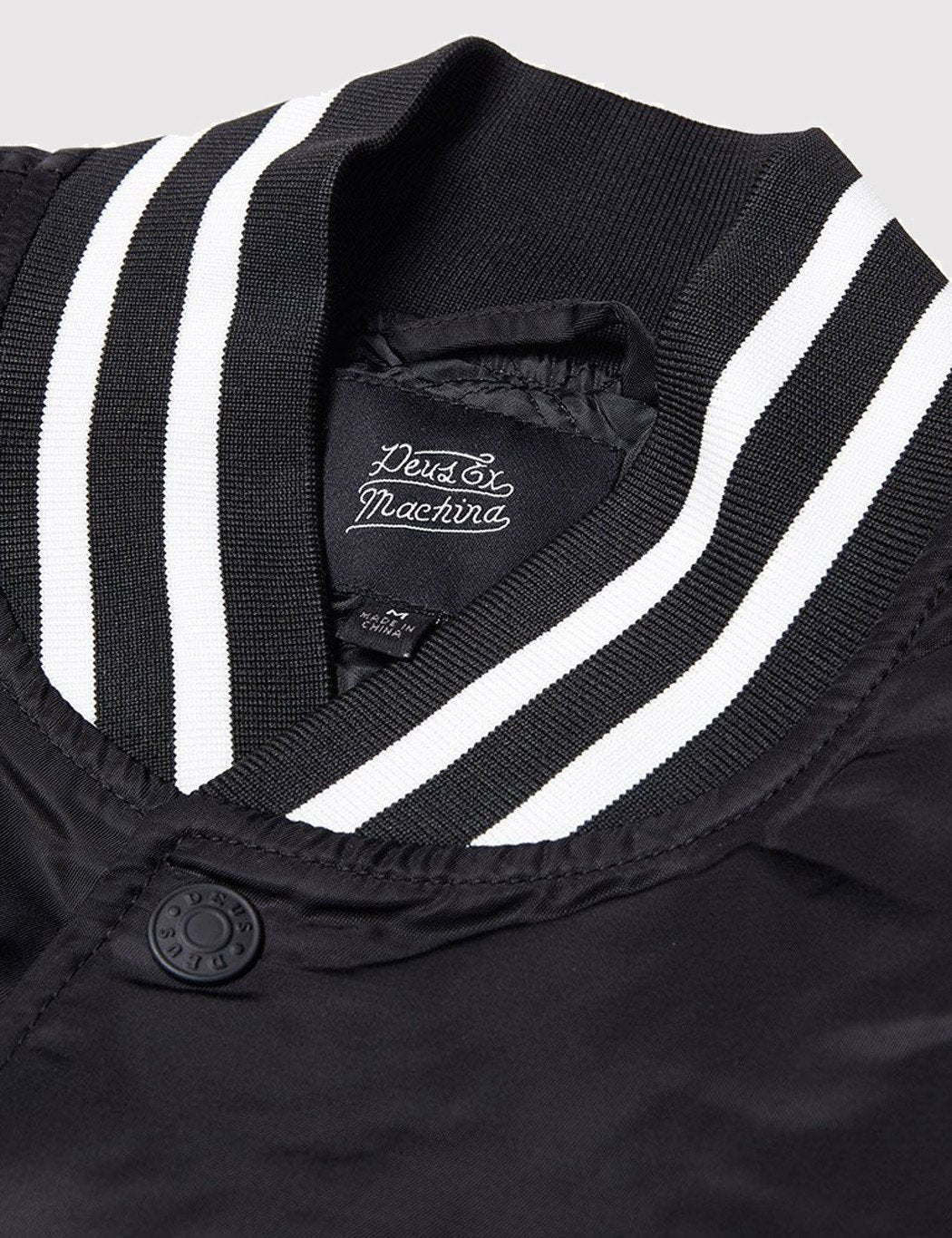 The Deus Ex Machina Chuck Bomber jacket in Black from the Deus Fall/Winter 2016 collection. It features a striped rib hem, cuff and collar, snap button front closure and contrast applique on back.