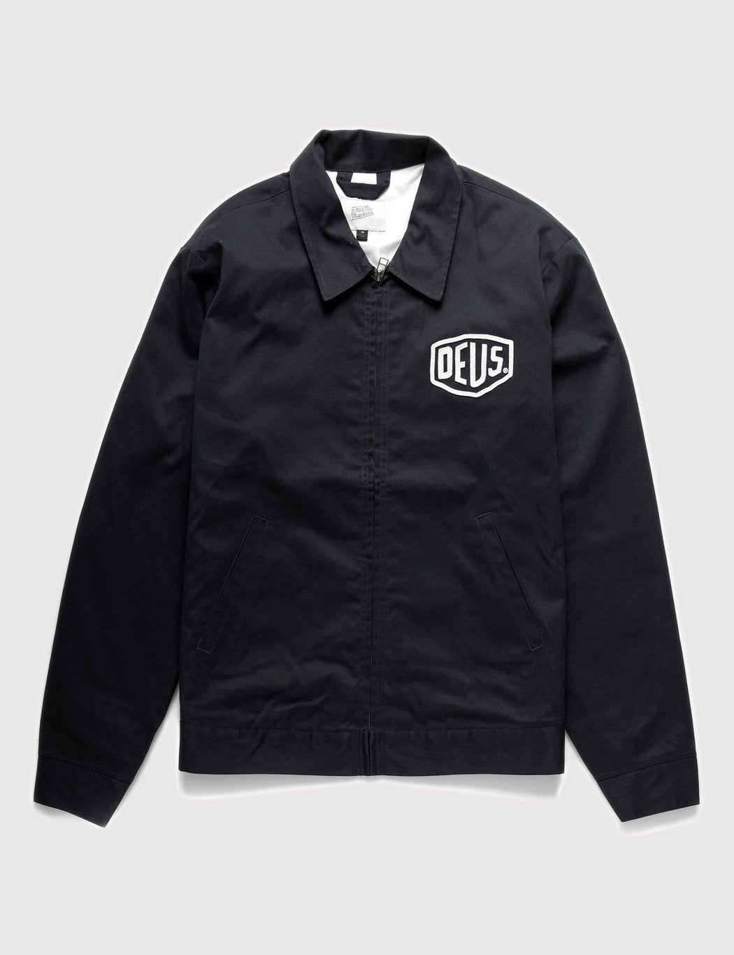 The Deus Ex Machina Workwear jacket in black from the Deus Ex Machina jackets core collection. This Deus jacket is a regular fit workwear jacket featuring a felt applique.